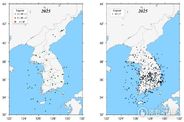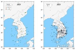 ㈜한국탑뉴스 한민석 기자 | 기상청은 2025년 한반도에서 발생한 지진의 통계와 특성을 종합적으로 정리한 '2025 지진연보'를 2월 25일 발간했다. 본 연보에는 규모 2.0 이상 지진의 현황, 진도 분포도, 발생 특성 등 상세 분석 결과가 수록되어 있다. 지난해 국내 지진은 총 79회로 연평균(72.8회)을 소폭 웃도는 수준이나, 2023년(106회)과 2024년(87회)에 비해 감소한 수치로 최근 3년 내 가장 낮은 기록이다. 이는 북한지역과 동해해역 지진의 감소에 따른 결과로 분석된다. 아울러 많은 국민이 느낄 수 있는 규모 3.0 이상의 지진 또한 총 4회로 2007년 이후 최저치를 보였다. 국내 지진 중 내륙에서 발생한 지진이 43회(54.4%), 해역에서 발생한 지진이 36회(45.6%)로, 내륙 지진의 비중이 다소 높았다. 내륙 지진은 남한 22회, 북한 21회로 남북한의 발생 빈도가 유사했다. 남한내륙에는 대구·경북에서 발생한 지진이 10회로 가장 많았다. 부산·울산·경남과 충북지역에서 각각 3회, 서울·인천·경기지역과 전북에서 각각 2회, 대전·세종·충남과 광주·전남지역에서 각각 1회 지진이 발생했으며,
