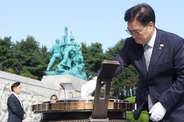 ㈜한국탑뉴스 차복원 기자 | 禹의장, 국립대전현충원 현충탑·홍범도장군 묘역 참배 "이름없이 스러져간 무명 독립군 기리는 것이 홍범도 정신" "독립전쟁의 역사 제대로 밝히고, 역사의 기록으로 남겨야“ ▲우원식 국회의장이 1일(수) 국립대전현충원을 찾은 모습.(사진=국회사무처 사진팀) 우원식 국회의장은 1일(수) 오후 국립대전현충원을 찾아 현충탑과 홍범도장군 묘역에 참배했다. 우 의장은 "홍범도장군은 독립운동 과정에서 가족을 잃고 강제이주까지 당하며 아주 어렵게 살았던 그야말로 민중의 한 사람이었다"며 "그가 가장 소중히 여겼던 동지들이 바로 이름없이 빛도 없이 스러져 간 무명 독립군"이라고 말했다. ▲우원식 국회의장이 1일(수) 국립대전현충원 현충탑에서 참배하고 있다.(사진=국회사무처 사진팀) 우 의장은 "1894년부터 1945년까지 51년간 한 번도 총을 내려놓지 않고 일본과 당당히 맞서 싸웠던 우리 독립전쟁의 자랑스런 역사를 제대로 밝혀야 한다"며 "홍범도장군의 정신을 기리는 것이 곧 우리나라의 정체성을 바로 세우는 것으로, 역사의 기록으로 남기기 위해 최선을 다하겠다"고 강조했다. ▲우원식 국회의장이 1일(수) 국립대전현충원 홍범도장군 묘역에서 참배하고