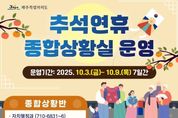 ㈜한국탑뉴스 차복원 기자 | 제주특별자치도는 2일 오영훈 지사 주재로 ‘2025년 추석 연휴 종합대책 보고회’를 열고 ‘모두에게 닿는 민생회복, 모두가 행복한 추석명절’을 슬로건으로 분야별 세부 추진계획을 점검했다. 이날 보고회에는 행정부지사, 정무부지사를 비롯해 안전건강실장, 특별자치행정국장, 행정시 부시장 등 30여 명이 참석했다. 제주도는 3일부터 9일까지 특별자치행정국장을 총괄로, 총 7개반 2,157명을 투입해 종합상황실을 운영한다. 도 7개반 555명, 제주시 7개반 875명, 서귀포시 9개반 727명이 참여하며, 하루 평균 308명이 현장에서 비상근무를 선다. 제주 120 만덕콜센터와 당직 근무자가 도민과 관광객 불편신고를 접수한다. 9월 23일 수립해 추진 중인 추석연휴 종합대책은 ▲민생경제 안정 ▲도민안전 확보 ▲교통·관광 편의 ▲도민불편 해소 ▲나눔실천 및 도민화합 등 5개 분야로 구성됐다. 물가안정 및 소비촉진을 위해 물가대책 종합상황실을 꾸려 추석 성수품 가격을 특별 관리하고 있다. 장바구니 물가조사를 주 1회에서 주 2회로 늘리고, ‘탐나는전’ 인센티브 13% 적