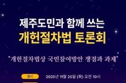 ㈜한국탑뉴스 송행임 기자 | 제주특별자치도의회, 제주특별자치도 주민자치위원회협의회, 제주대학교 리걸클리닉센터, 제주미래디자인포럼, 사회적협동조합 제주로 공동 주최로 11월 25일 오전 10시, 제주특별자치도의회 1층 대회의실에서 '제주도민과 함께 쓰는 개헌절차법 토론회'를 개최한다. 국민주권 시대에 국민이 주도하는 헌법 개정 요구가 커지고 있고 이에 시민의회 방안, 국민청원 방안, 추진협의회 방안 등 국민참여방안을 담은 개헌절차법안이 3건이 국회에 발의됐지만 3건 법안의 국민참여방안은 제주도민의 의견을 충분히 반영하기에는 미흡하다는 지적이 있음에따라 이번 토론회는 제주도민의 목소리가 실질적으로 담길 수 있는 개헌절차법 제정 방안을 깊이 있게 모색하기 위해 마련됐다. 토론회는 이상봉 제주특별자치도의회 의장의 인사말로 시작하여 이남근 제주특별자치도의회 의원이 좌장을 맡고 신용인 제주대학교 로스쿨 교수가 '개헌절차법상 국민참여 방안 쟁점과 과제'를 주제로 발표할 예정이다. 또한 고정학 제주특별자치도주민자치위원회협의회장, 신훈민 변호사, 양광수 아라동 주민자치위원장, 조현주 국민주도상생개헌행동 상임공동대표가 제주도민의