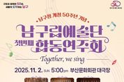 ㈜한국탑뉴스 차복원 기자 | 부산 남구는 오는 11월 2일 오후 17시 부산문화회관 대극장에서‘남구립예술단 합동 연주회 Together, We Sing’을 개최한다. 남구립예술단은 ▲소년소녀합창단(지휘 김주곤) ▲오륙도여성합창단(지휘 곽기웅) ▲욜드합창단(지휘 고영호)으로 구성되어 있으며, 남구를 대표하는 문화사절단으로 활발히 활동하고 있다. 이번 연주회는 남구청 개청 50주년을 기념하여 세 합창단이 처음으로 함께하는 합동 연주회라는 점에서 특별한 의미를 지닌다, 각 합창단의 개성과 감성을 담은 다채로운 무대를 통해 관객에게 풍성한 음악적 경험을 선사할 것으로 기대된다. 소년소녀합창단은 맑고 순수한 목소리로 음악극‘푸른 하늘 은하수’를 선보이고, 오륙도여성합창단은 ‘그리움 그리고 사랑’이라는 테마로 세대를 이어주는 따뜻한 감성의 하모니를 들려주며, 욜드합창단은 인생의 깊이와 여운이 느껴지는 ‘행복한 인생’이라는 감동의 무대를 마련했다. 특히 이번 공연의 하이라이트는 세 합창단이 함께 꾸미는 합동무대다. 서로 다른 세대의 목소리가 한 무대에서 하나의 선율로 어우러지며, 노래를 통해 마음을 나누고 세
