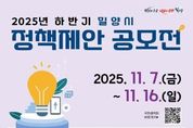 ㈜한국탑뉴스 차복원 기자 | 경남 밀양시는 시민의 창의적인 아이디어를 시정에 반영하기 위해 오는 7일부터 16일까지 ‘2025년 하반기 정책제안 공모전’을 실시한다고 밝혔다. 이번 공모전은 △인구, 청년 △지역경제, 일자리, 산업 △문화, 관광 △보건, 복지 △주거, 안전, 환경 △농업, 기타 등 6개 분야로 나눠 진행되며, 밀양 시정에 관심 있는 국민 누구나 참여할 수 있다. 시는 이번 공모를 통해 시민과의 소통을 강화하고, 정책 수립 과정에 시민 참여를 확대해 실제 시정에 반영할 수 있는 창의적이고 현실적인 아이디어를 적극 발굴할 계획이다. 참여 방법은 국민권익위가 운영하는 국민생각함 또는 시 정책공모 담당자 이메일로 제출하면 되며, 우편 및 방문 접수(밀양시 밀양대로 2047, 밀양시청 5층 인구정책담당관실)도 가능하다. 접수된 제안은 △실시 가능성 △창의성 △효율성 △적용 범위 △계속성 등을 기준으로 담당 부서의 1차 내부 심사, 외부 전문가가 참여하는 2차 우수제안심사위원회 심사를 거쳐 최대 17건의 우수 제안이 선정된다. 선정된 제안에는 금상 1명(100만원), 은상 2명(각