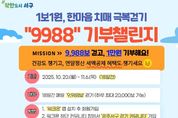 ㈜한국탑뉴스 차복원 기자 | 광주광역시 서구가 오는 20일부터 11월 6일까지 18일간, 치매 인식 개선과 기부문화 확산을 위한 ‘1보1원, 한마음 치매극복걷기 9988 기부챌린지’를 진행한다. 이번 챌린지는 치매상담콜센터 홍보와 함께 주민 참여를 통해 치매 극복에 대한 지역사회의 관심을 높이기 위해 기획됐다. 치매상담콜센터는 연중무휴로 전문상담사가 맞춤형 상담을 제공하는 서비스로 ‘18세 기억을 99세까지, 99세까지 팔팔(88)하게’라는 의미를 담고 있다. 참가자는 ‘워크온(Walk On)’ 앱을 활용해 하루 평균 9988보를 달성할 경우 ‘1만원 기부권’을 받을 수 있으며 챌린지 종료 후 만족도 조사와 기부 동의 절차를 완료하면 기부권이 서구 관내 취약계층 치매환자 가구에 전달된다. 서구는 총 300명의 챌린지 달성자를 목표로 하며 누적 기부금 300만 원은 치매환자 30가구에 각 10만 원씩 전달할 예정이다. ‘9988 챌린지’ 참여가 어려운 주민은 하루 동안 1만보를 걷고 1만 원을 기부하는 ‘1보1원 순수기부’에 참여할 수 있다. 김이강 서구청장은 “치매는 개인의