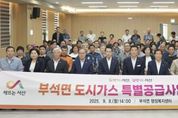 ㈜한국탑뉴스 차복원 기자 | 충남 서산시는 지난 8일 부석면 행정복지센터 회의실에서 부석면 도시가스 특별 공급 사업 착공식을 개최했다고 밝혔다. 이날 착공식에는 이완섭 서산시장, 부석면 주민 등 40여 명이 참석했으며, 도시가스 공급을 위한 사업 착공을 축하하는 시간을 가졌다. 해당 사업은 인지면 일원부터 부석면 행정복지센터 일원까지 약 10㎞의 도시가스 배관을 연결하는 사업이다. 총사업비 60억 원이 2025년부터 2026년까지 투입되며, 사업이 완료되면 부석면 120여 세대가 도시가스를 사용할 수 있게 된다. 시는 에너지 소외지역이었던 부석면 일원 주민의 난방비 절감, 안정적인 에너지 사용 등을 통해 주거환경의 개선과 생활 복지 향상이 이뤄질 것으로 전망했다. 특히, 이번 특별 공급 사업은 운산면에 이어 두 번째로, 도시와 농촌 간 생활 격차를 줄이고 에너지 복지 사각지대 해소에 이바지할 것으로 기대된다. 이완섭 서산시장은 “이번 사업이 부석면 주민들의 생활 편의와 안전에 보탬이 되길 바란다”라며 “앞으로도 시민의 에너지 복지 증진을 위해 다양한 시책을 추진해 나가겠다”